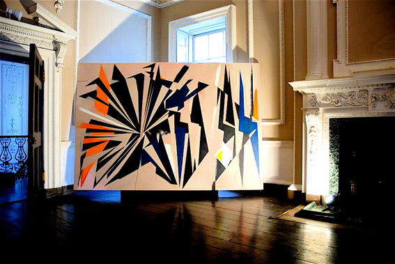 For the first time the artist is using curves in his paintings; teardrops, paisley and foliate shapes set against modulating backgrounds – gestures which reference a very specific story of Venezuelan architectural design and the Lakes contained therein.